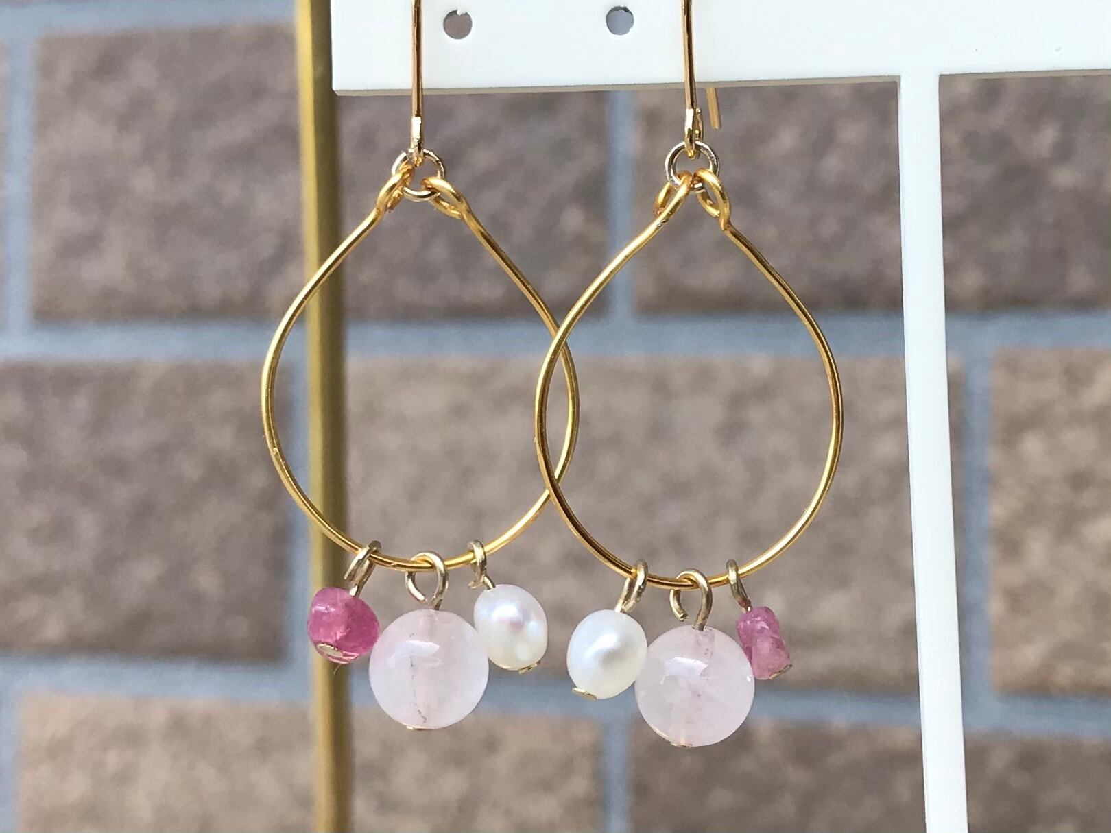 ゴールドのフープに淡水パールとピンク系の天然石で柔らかい雰囲気にしました。